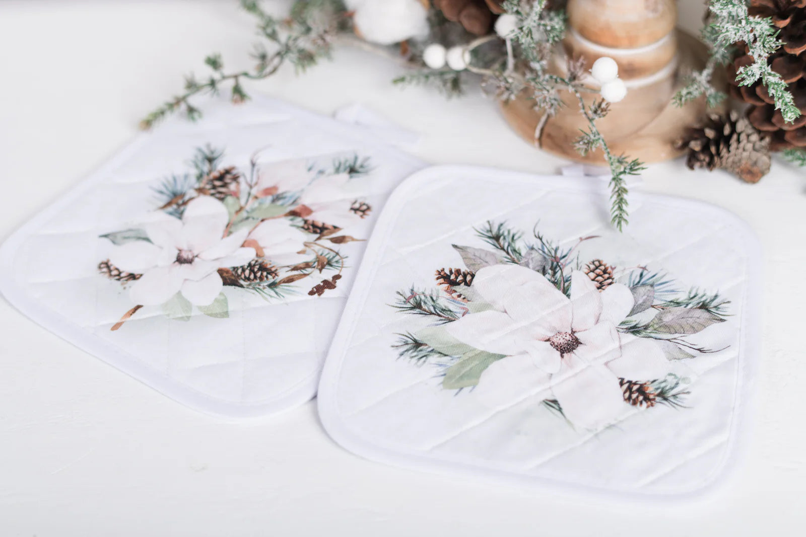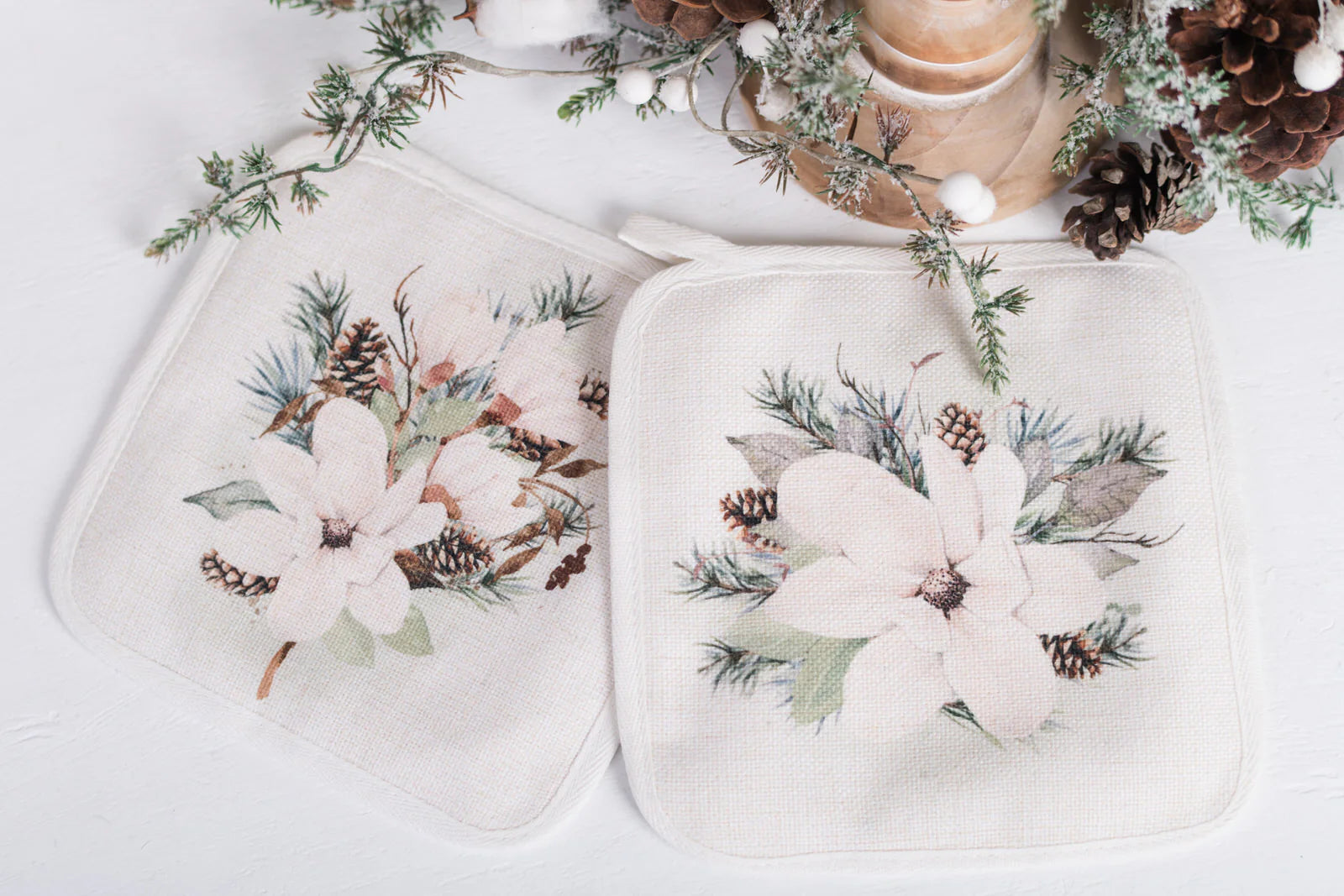 Linen with design on the front and a silver heat resistant fabric on the back.Set of 2Gentle wash and lay flat to dry.