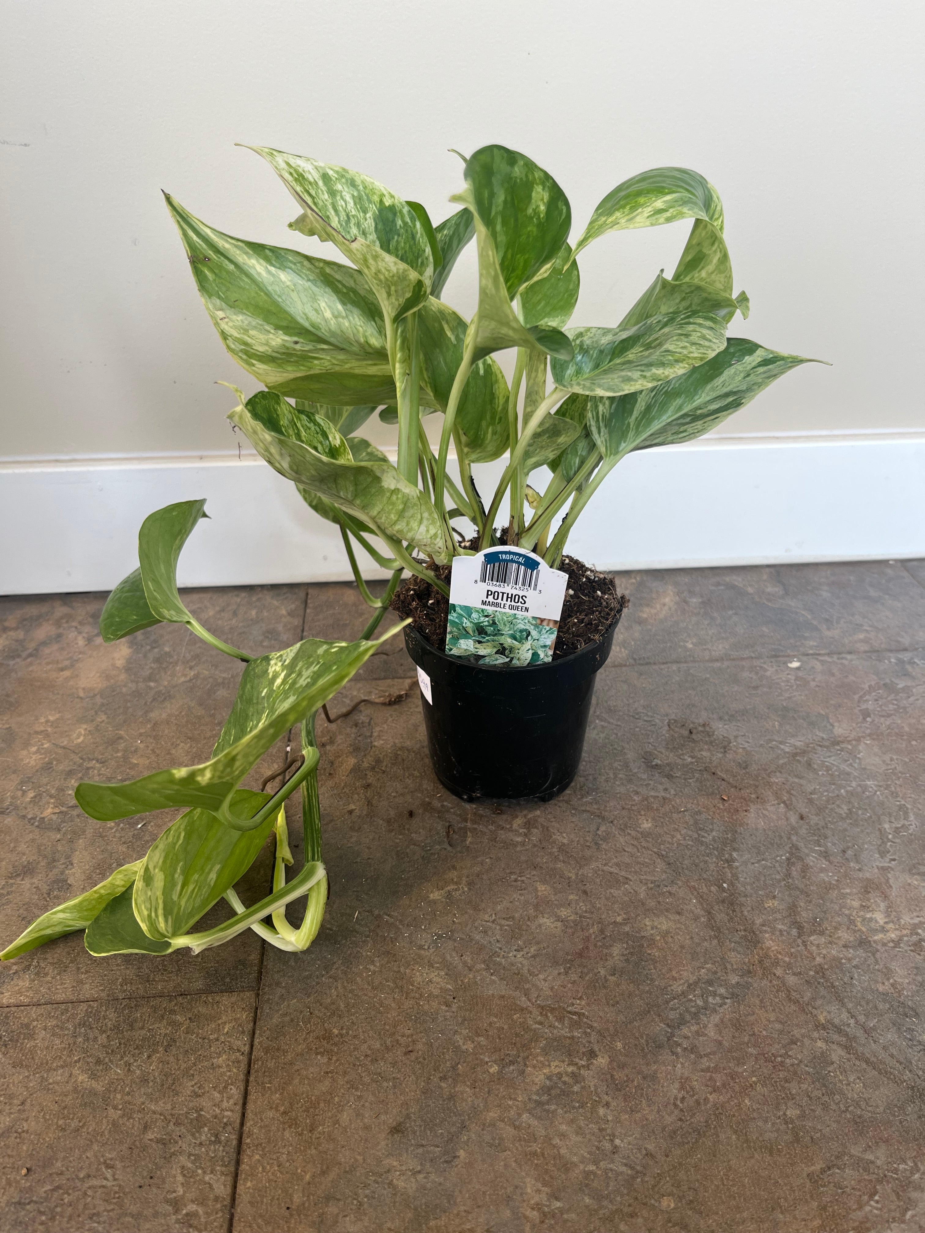 To care for a Marble Queen Pothos, provide bright, indirect light to maintain its variegation, and water when the top inch of soil feels dry to prevent root rot. Use a well-draining potting mix, maintain average home temperatures (60-85°F or 15-29°C), and provide high humidity if possible. Fertilize monthly during spring and summer, prune as needed for fuller growth, and be aware that it's toxic to pet