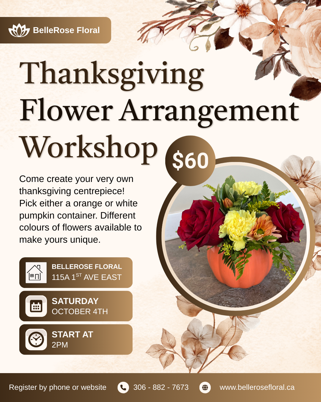 Come enjoy a night out with friends and families to create your very own Thanksgiving floral centrepiece for your table!